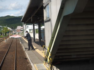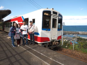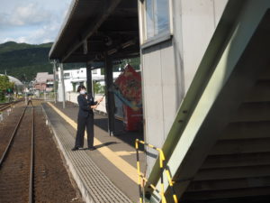 出発するときに、駅員さんが大漁旗を振ってくれるんですよ。